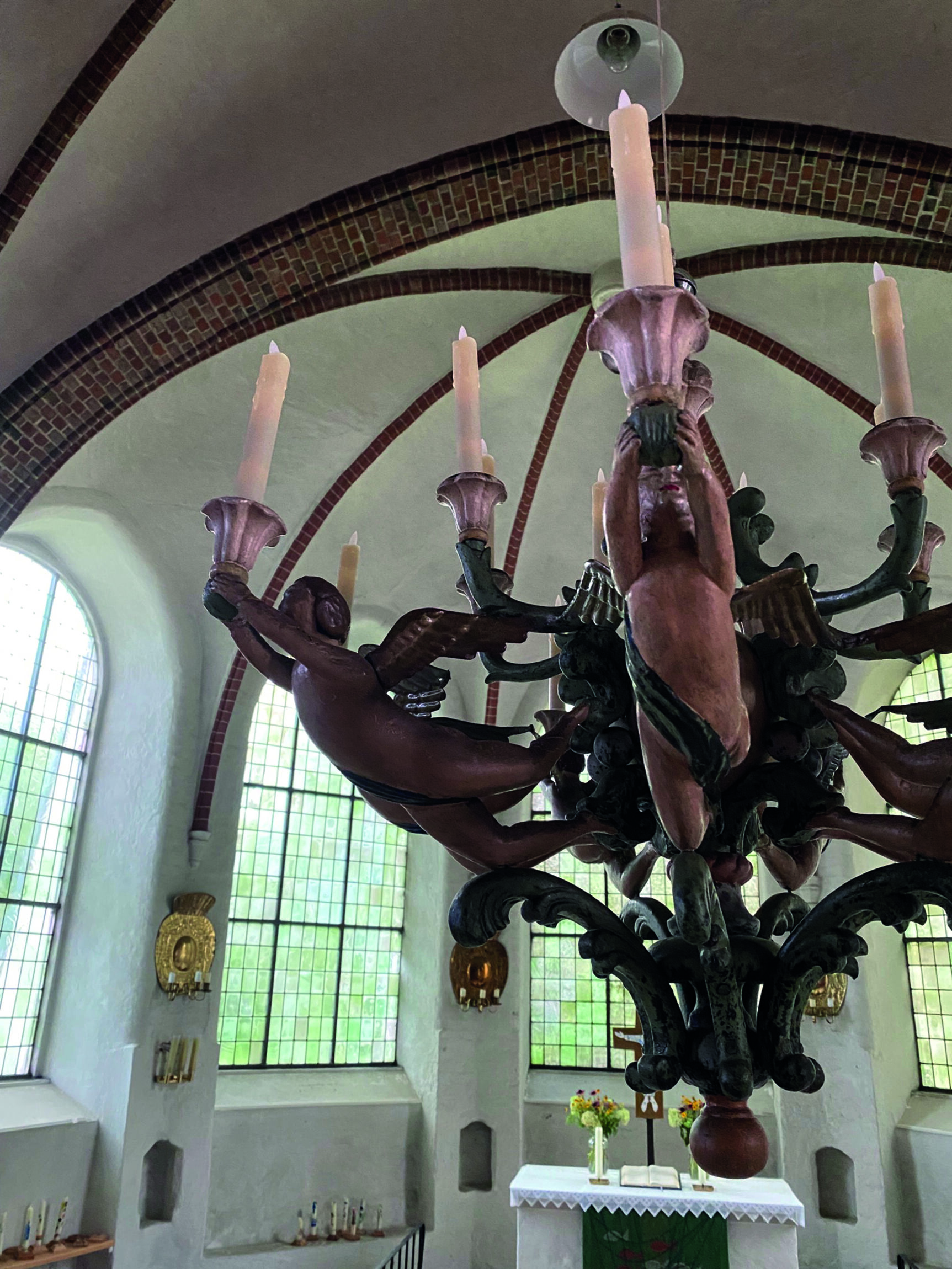 Man sieht es in unserer Kirche, da hängt der Engelleuchter gleich vorne an der Decke. Auch in den vergoldeten Blakern im Altarraum sind singende Engel dargestellt. Das Lob der Engel ist also in unserem Altarraum immer gegenwärtig. Und unsere Kirche ist voll davon. Wir dürfen uns in jedem Gottesdienst in diesem Lob versammeln.